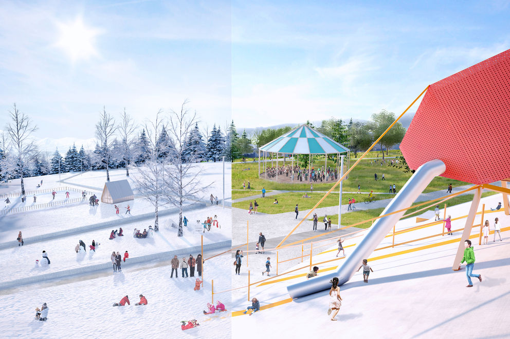 Du côté des pistes de ski, le projet développe une grande esplanade pour pouvoir regarder les différentes activités qui se déroulent dans la pente, profiter du soleil, boire un verre en terrasse… Cette esplanade est le lieu parfait de «l’after ski» et renforce le potentiel touristique de la station. Le cœur vert du village se structure autour d’un parc central «toutes saisons» destiné aux habitants et aux visiteurs avec luge été/hiver, scène, aires de jeux et de pique-nique. Il se connecte au parcours panoramique grâce à des jardins thématiques transversaux.